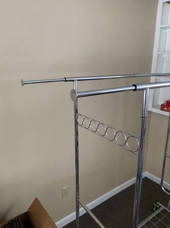 This is a nice metal clothing rack. It has 4 lockable wheels. The top racks also have extensions.