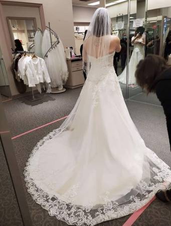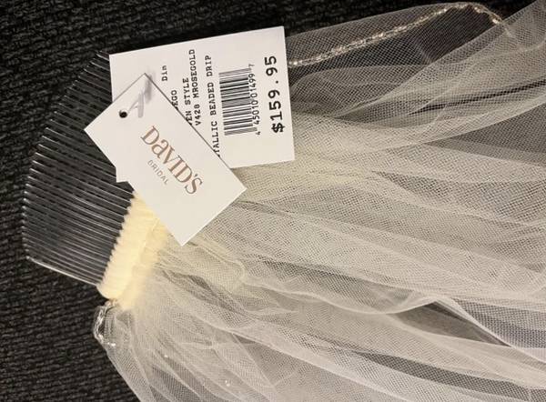 Wedding Dress from David’s Bridal. Vintage rose in color with lace trim. Beautiful dress, size 12- never altered, never worn. Matching rose gold beaded veil.