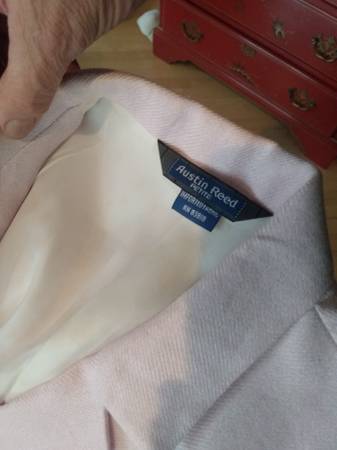 This pale pink blazer by well known Austin Reed is a must have for any collection of clothes in your closet. Make a statement anytime and support breast cancer.