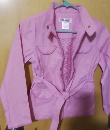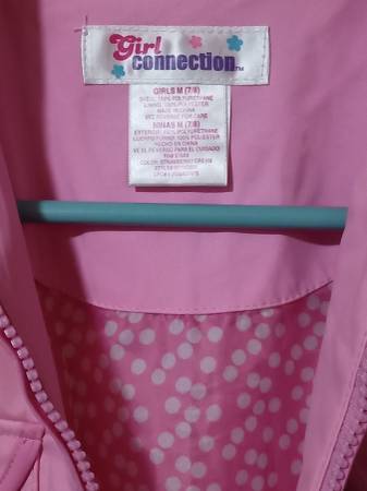 Singing, Dancing and Playing In the Rain! This stylish pink raincoat is: fabric lined with zip front with collar snap, 4 snap close pockets and tie belt. Fits girls size M (7/8) *Pet and Smoke Free...