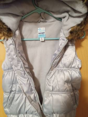 So Cute and Warm! This satin puffer vest is polar fleece line, with slit front pockets and sturdy front zipper. It is a fashionable pale grey/silvery satin with fur trimmed hood in girls size M/8....
