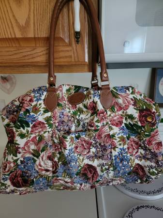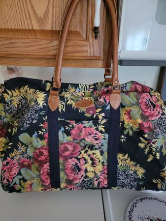 HAS LONG HANDLES AND 2 POCKETS AND A ZIPPER POCKET INSIDE.