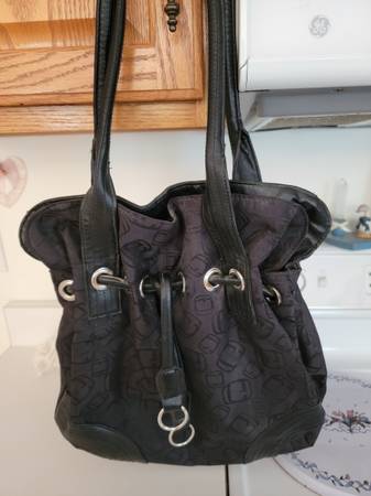3) IS A BLACK EXPENSIVE FANCY HANDBAG WITH SILVER RINGS THAT BLACK ROPE GOES THROUGH AND IT HAS BLACK HANDLES.