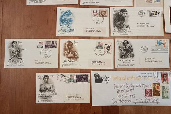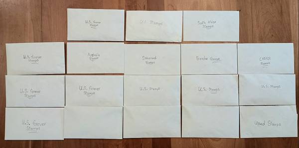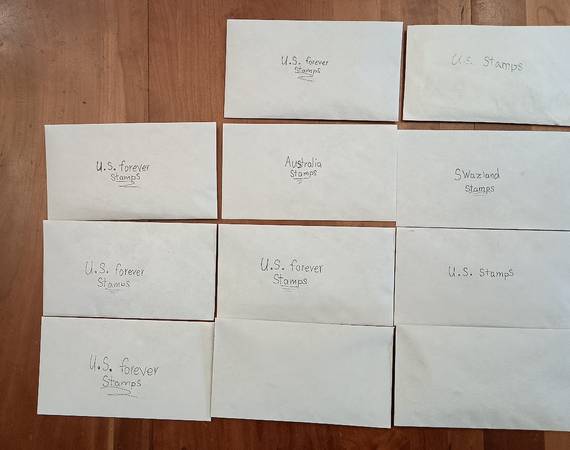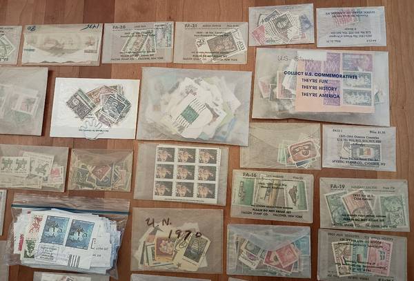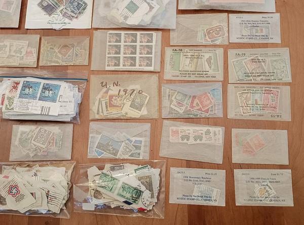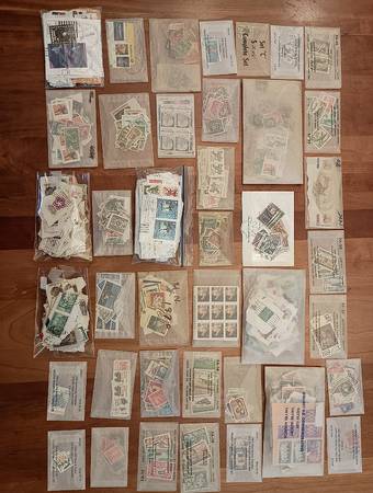 This stamp collection contains: unattached stamps (very few with hinges), old Postcards with stamps (~1940-1997), stamps on envelopes, and stamps on small pieces of paper. (Cut out from envelopes) I have ~50 hinges that may or may not be good; I've had them for years.