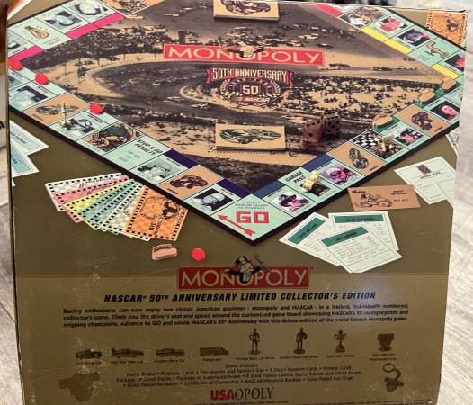 Vintage 1997 NASCAR 50th Anniversary Limited Collector’s Edition Monopoly Game. Used once, in excellent condition with all pieces included. Box with Sleeve. See pictures for details. Excellent gift for any NASCAR lover!!! Asking $100. . Can meet in Colchester, VT. If it’s posted, I still have it.