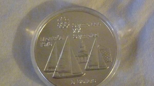 Coin #4, $5 Canadian - depicts Kingston, Ontario, site of the sailing events & highlights yachts against the skyline of Kingston