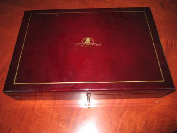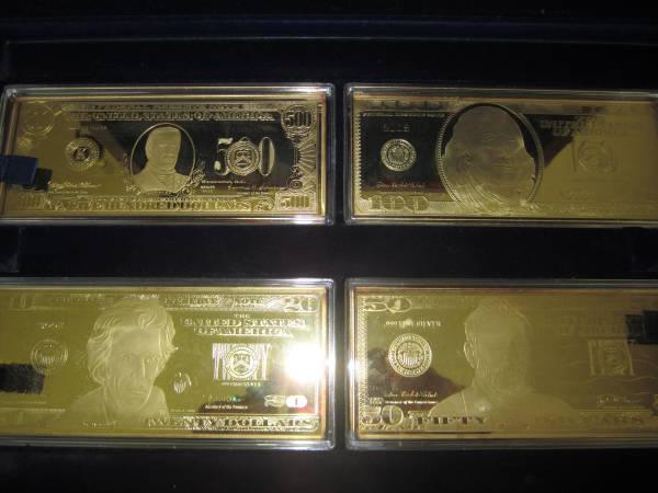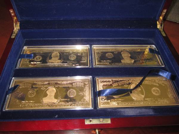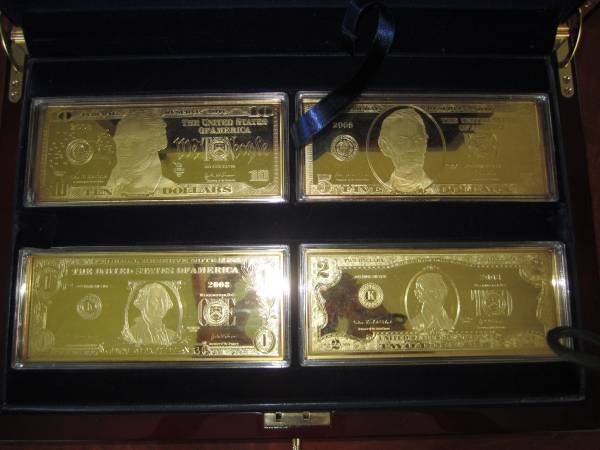 Each bill contains four ounces of .999 silver and is layered in 24 kt gold plate. Includes certificate of authenticity and locking wooden display case with key.