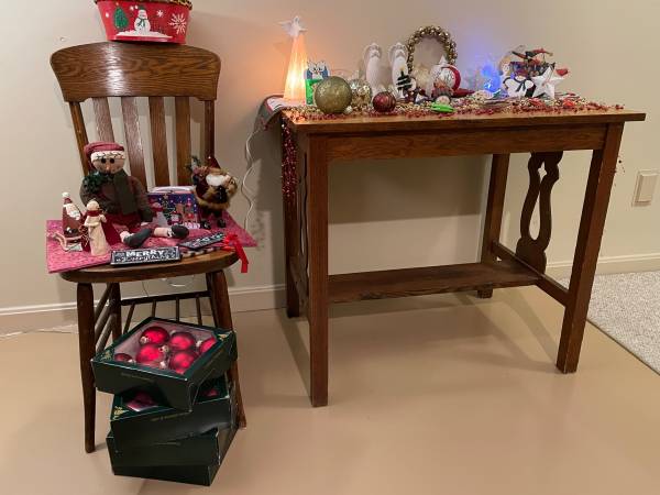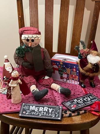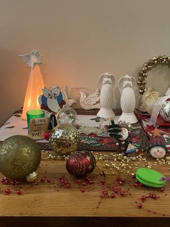An assortment of Christmas decorations include 4 placemats, 30 red glass balls, 2 angels that light up plus more angels!, a doll, jingle bell wreath, mini xmas lunch box, signs, garland and many ornaments - what else would you need? Merry Christmas!! $30. firm, cash only please.