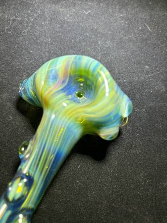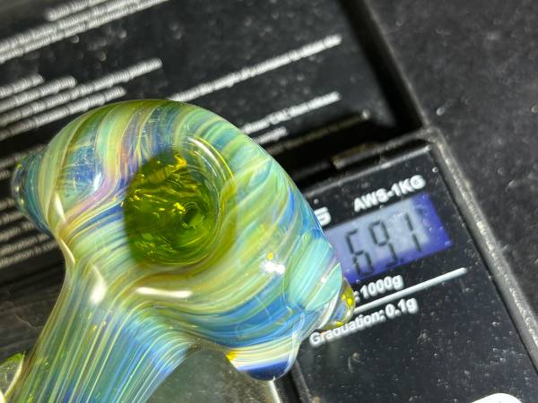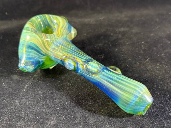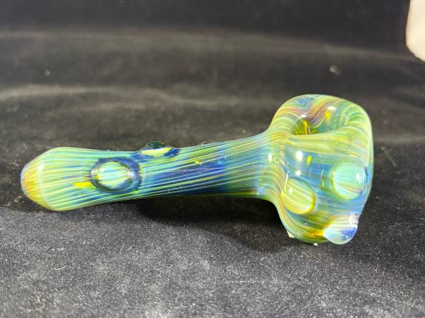Bluish, greenish, yellowish “sea foam” colors swim throughout this Beautiful US Handblown Borosilicate spoon shaped hand pipe that is fumed with silver and adorned with marbles on neck and the right of head. Med sized but deep bowl. Large pulled Left side carb. Brand new out of the shop. Unsmoked. Approx 4.5” long and 69.1 grams