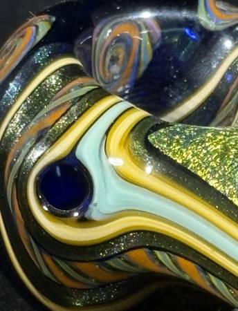 Yellow "crushed opal" dichro on Cobalt in the neck with line work and teal “flower" on the head. This handpipe is Approx 4.5” long and weighs 99.3 grams