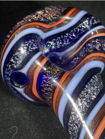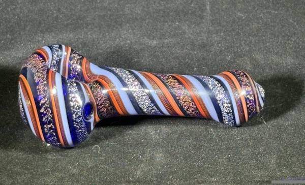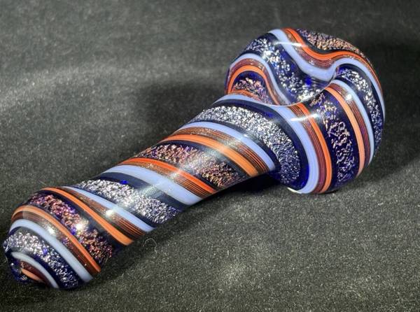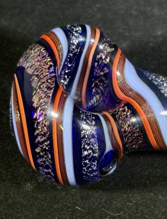 Heavy, Dual coloured Fire & Ice orange n silver “crushed opal" dichro on Cobalt from head to mouth, with blue and orange line work. This hand pipe is Approx 4.5” long. 98.5 grams