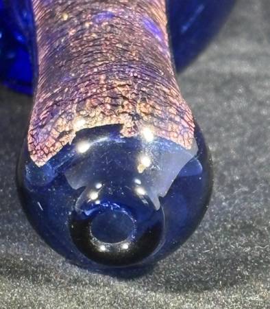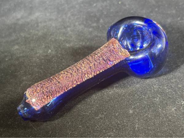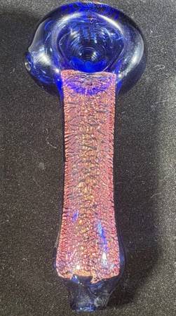 Heavy, Red/orange "crushed opal" dichro on Cobalt in the neck with beautiful Red and White cane, Spiraled Coral like pattern swirl on head handpipe. Approx 4.25" long. 62.10 grams