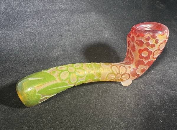 US made, by artist Joe P., Heavy, Handblown, Beautifully DEEP Carved/Etched, multi-colored (Rasta red, yellow, green) Floral & Bee Themed Footed Sherlock Pipe. Medium depth bowl, large left side carb, brand new outta shop. Approx 5.5” long. 59.4 grams