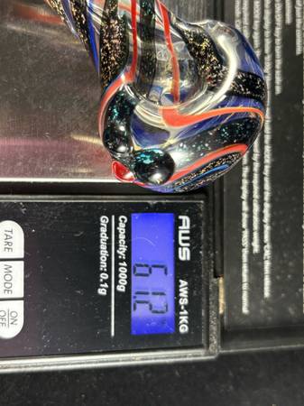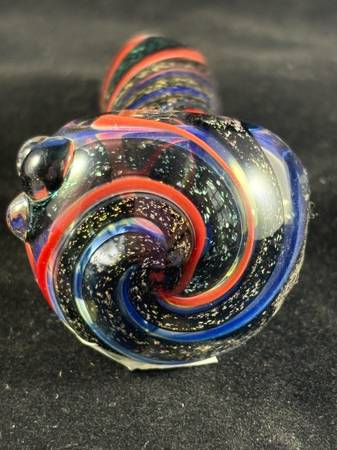 US Handblown very thick and heavy borosilicate glass hand pipe silver fumed with peach and teal dichro and red line work. The silver fuming will turn bright blues. Brand new out of shop. Unsmoked. Approx 4” long and 61.2 grams
