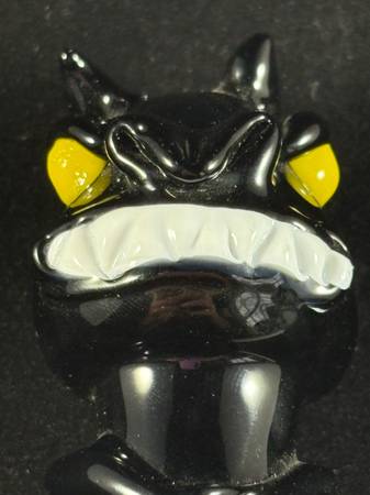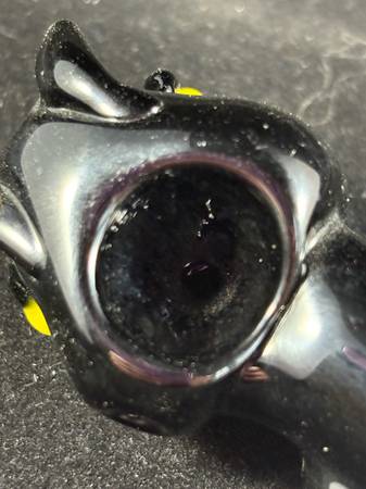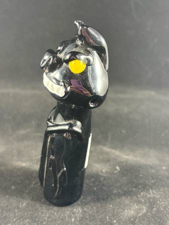 US Made Handblown Glass Sculpted Bat Hand Pipe. Black with Bright Yellow Eyes. Med sized bowl. Flat mouth piece. Right side carb. Brandy new out of shop. Unsmoked. Length approx 4.25” Weight 67.3 grams