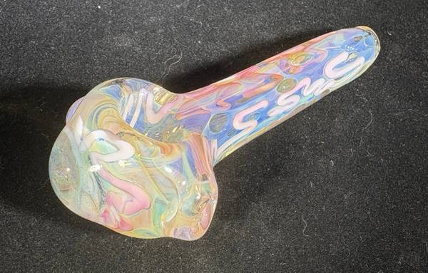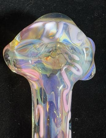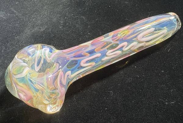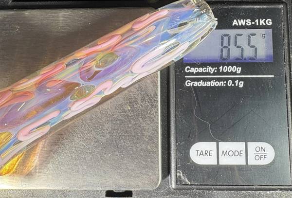 Thick and Very Heavy, 85.5 grams, from US/NY artist Kyle R. Hand Blown Borosilicate Glass Pipe, Silver Fumed and Color-Changing with pink line work. Marble on the head and two on the right when looking down. Large left side pulled carb. Medium sized bowl.