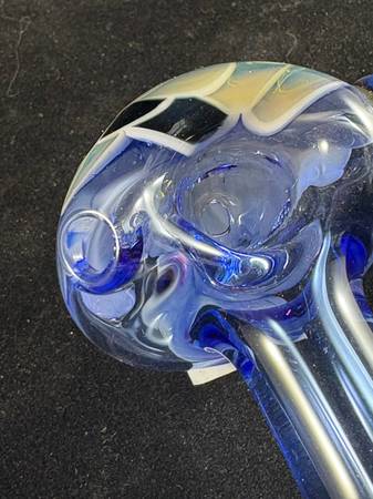 US/VT Glass Hand Blown Heavy Borosilicate Hand Pipe. Spoon Shaped. Black and Lavender/Light Gray Dot Stack on Cobalt. Very deep bowl. Left side carb.