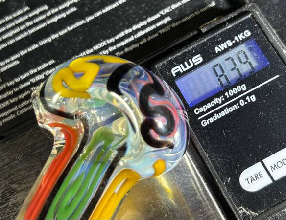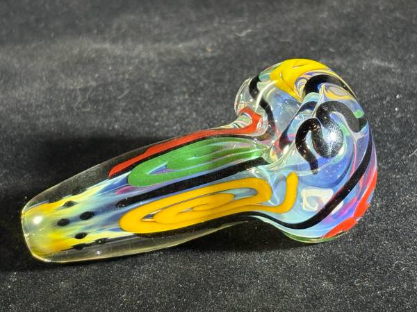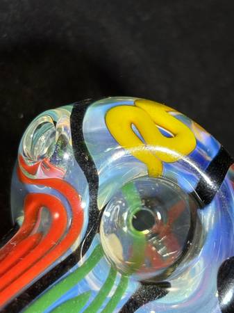 Stoopid thick and heavy US/AZ Handblown borosilicate hand pipe. Rasta colored line work with black. Silver fuming will turn beautiful blues. Deep bowl and left side carb. New from the shop. Unsmoked. Approx 3.5” long and 83.9 grams