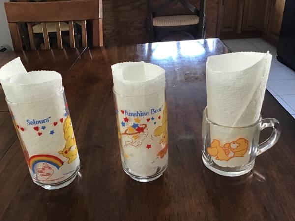Funshine Care Bear glasses from a series of six glasses made by American Greetings for the Canadian market . Care Bears Glass Mug / Cup by American Greetings Corp. 1984 - Funshine Bear Care Bear ....