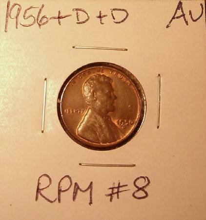 Offered from my long-time personal collection is this 1956-D Lincoln Small Cent "Double D'S". This Blazing Beauty has two totally separate "D" Mint-Marks. The second of which is South, or below the Strong Upper D Mint Mark, referred to as RPM #8. This coin is a Prime Specimen for grading in AU condition. *The reference picture is courtesy of Coppercoins.com showing the attributed 1956-D over D RPM #8 specimen for comparison, confirming this Rare Variety in comparison to our coin listed for sale.