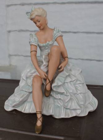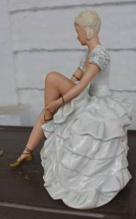 Excellent condition with no chips, cracks, or flaws. Vintage figurine of a ballerina dancer lacing up her shoes. She has beautiful facial features. Gold trim showing virtually no wear. She is made of high-quality porcelain by Schaubach Kunst and is in perfect condition
