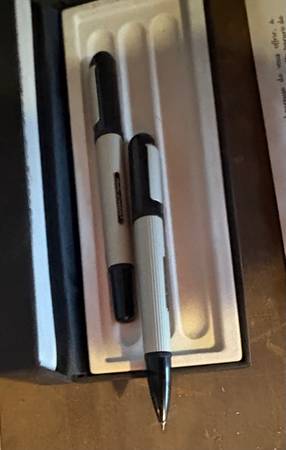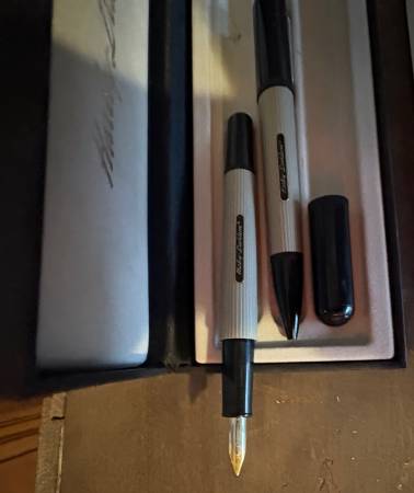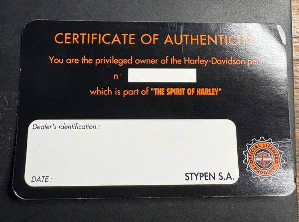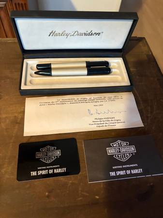 Fountain pen is retractable, as is ball point pen. A legit Harley sanctioned collectible. The empty tray is for an adapter to use the fountain pen without a cartridge, which you do not want! It’s explained in the pamphlet.
