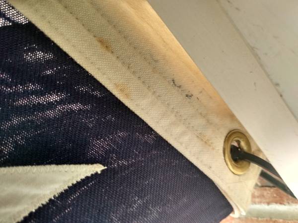 Condition: HARDLY ANY WEAR IN THE FABRIC ITSELF. There is some minor discoloration in the white stripes and some mildew staining there as well. (See pics) The blue and white starred area is in perfect shape. There are NO rips or tears.