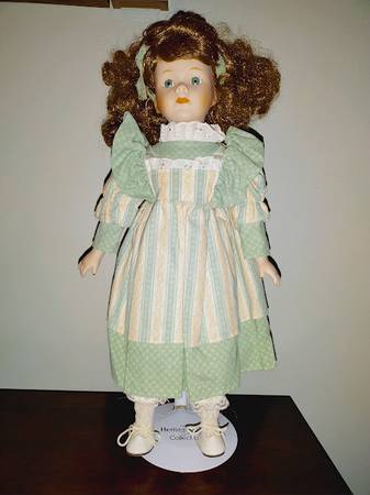 This porcelain hand painted doll is part of the Vintage Collection Series from the Heritage Mint. There is the hallmark on the back of her neck. She is a 17 inches tall, curly red hair with beautiful green eyes. She is wearing a muted green, orange and cream dress & matching headband with bloomers and white shoes.