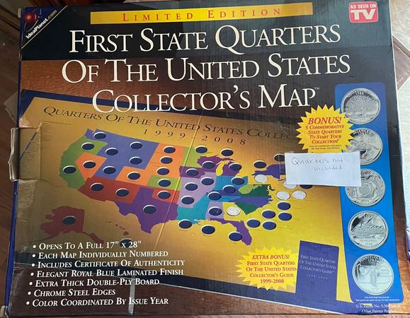 First State Quarters of the United States Collector's Map (1999-2008) With Box. Collector’s Guide & Certificate of Authenticity. Quarters NOT INCLUDED. Have 2 of—$10 each or $16 for both.
