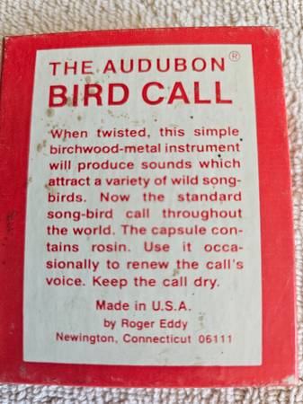 Set in the original packaging, this wooden and metal bird call by Audubon was made in Newington, CT by Roger Eddy. There is a red topped tiny capsule which holds rosin, used to occassionally renew...