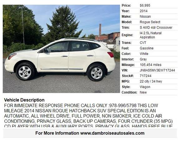 FOR IMMEDIATE RESPONSE PHONE CALLS ONLY :978-996/5798 THIS LOW MILEAGE 2014 NISSAN ROGUE HATCHBACK SUV SPECIAL EDITION IS AN AUTOMATIC, ALL WHEEL DRIVE, FULL POWER, NON SMOKER, ICE COLD AIR CONDITIONING, PRIVACY GLASS, BACK UP CAMERAS, FOUR CYLINDER (35 MPG) CD PLAYER WITH USB & AUXILIARY PORTS, PRIVACY GLASS, HANDS FREE BLUE TOOTH, FOUR NICE MEATY ALL WEATHER TIRES, RECENT NEW BRAKES & ROTORS, THIS VEHICLE HAS BEEN FULLY SERVICED, GUARANTEED INSPECTION IN ANY STATE AT $6995!!! FOR IMMEDIATE RESPONSE PHONE CALLS OR TEXT ONLY: 978-996/5798 LOW 105K MILES ALSO 5 STAR REVIEWS GOOGLE DAMBROISE AUTO SALES 185 LINCOLN ST LOWELL MA 01852 THANK YOU