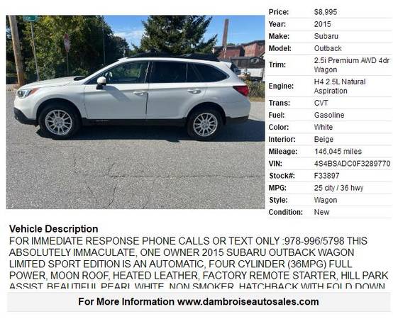 FOR IMMEDIATE RESPONSE PHONE CALLS OR TEXT ONLY :978-996/5798 THIS ABSOLUTELY IMMACULATE, ONE OWNER 2015 SUBARU OUTBACK WAGON LIMITED SPORT EDITION IS AN AUTOMATIC, FOUR CYLINDER (36MPG) FULL POWER, MOON ROOF, HEATED LEATHER, FACTORY REMOTE STARTER, HILL PARK ASSIST, BEAUTIFUL PEARL WHITE, NON SMOKER, HATCHBACK WITH FOLD DOWN REAR SEATS, CD PLAYER WITH USB & AUXILIARY PORTS, HANDS FREE BLUE TOOTH, SPORT WHEELS WITH NICE MEATY ALL WEATHER MICHELIN TIRES, THIS VEHICLE HAS BEEN FULLY SERVICED, AND GUARANTEED INSPECTION IN ANY STATE AT $8995!!!! FOR IMMEDIATE RESPONSE PHONE CALLS OR TEXT ONLY :978-996/5798, LOW 146K MILES, ALSO 5 STAR REVIEWS GOOGLE DAMBROISE AUTO SALES 185 LINCOLN ST LOWELL MA 01852 THANK YOU !!!!
