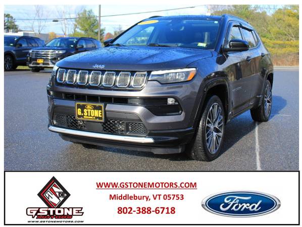 This is a 2022 Jeep Compass Limited. This SUV is a 4X4 and powered by an aggressive 2.4L engine with 34K miles. This is in good condition, is well maintained and comfortably loaded with power heated and cooled leather trimmed seats, power windows and locks, cruise, tilt, foot activated liftgate, backup camera, remote start, 360 camera and more. Give us a call for more information 802-388-6718. At G. Stone Motor's we take anything in trade.