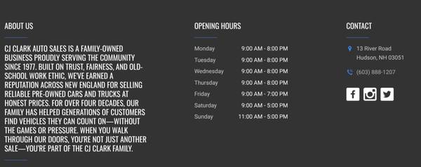 CJ Clark Auto Sales is a family-owned business proudly serving the community since 1977. Built on trust, fairness, and old-school work ethic, we've earned a reputation across New England for selling reliable pre-owned cars and trucks at honest prices. For over four decades, our family has helped generations of customers find vehicles they can count on—without the games or pressure. When you walk through our doors, you're not just another sale—you’re part of the CJ Clark family.
