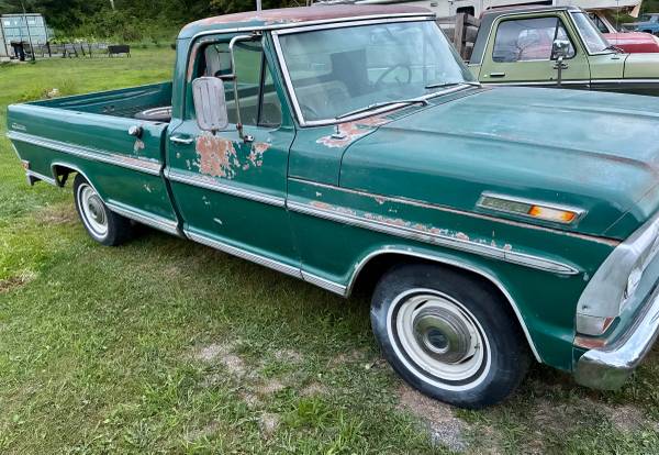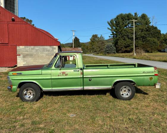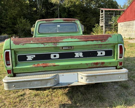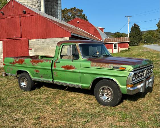 1972 F100 2wd long bed. Green with exquisite patina! 360 auto with power steering and power 4 wheel disc brakes. Retro sound radio with aux inputs. Rebuilt trans, 3.73 9” rear. Ac that should work with a can of Freon. Nice running and driving truck. Will be on stock steel wheels with hubcaps, and new tires soon. 12,000