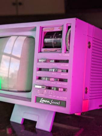 A cute little 1986 Lenoxx brand blank-and-white television with AC adapter. Might back a good accessory for a YouTube set backdrop or something. In decent shape: The only blemishes are some missing plastic shielding / glue or other residue on the face and back of the unit. Tested using the stock AC adapter and I couldn't get it to work. Maybe you'll have more luck. Ships from USA.