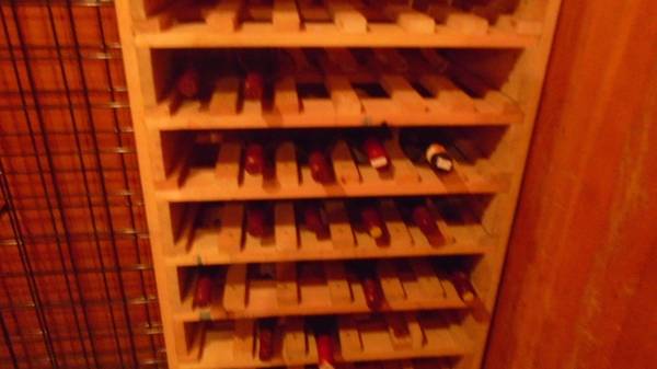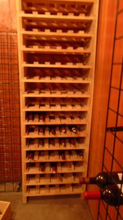 And for those who want really fancy a beautiful hand made wooden wine rack for the fatter bottles that don't fit on the steel racks. Cost $250 holds about 120 bottles