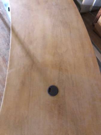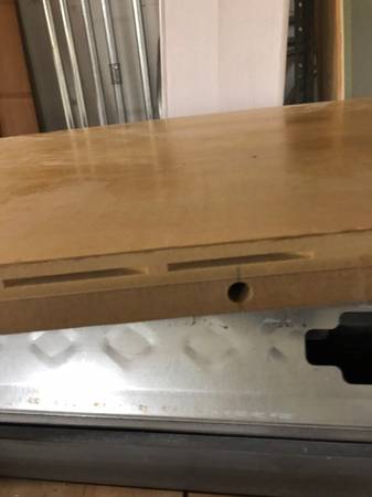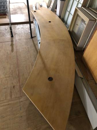 Return leg 23" x 46", finished edges on inner side of radius. 3/4" thick hardwood, with 3/4" thick build up. Clear coat finish shows some wear, surface scratches. Return leg is damaged in one area as pictured. Store indoors heated area since removed from former medical office reception area. Please email questions, local pick up Bristol, Vermont. $229. , cash preferred.