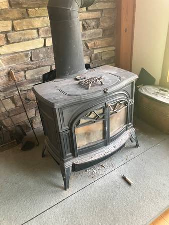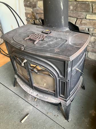 Vermont castings defiant wood stove model 1610 for sale. $250. Large cast iron sized home heating wood stove in decent condition. Needing to move it and pricing it low, there is a very small crack on the top (pictured) but I’ve been run in it in my house for several years (myself or previous owner never rain it full time) and have just not got around to sealing it with furnace cement which is easy, but it’s runs well as is. I can help you get it out of my house. Single story just a few steps to level ground. Very good deal!
