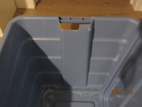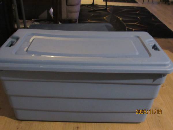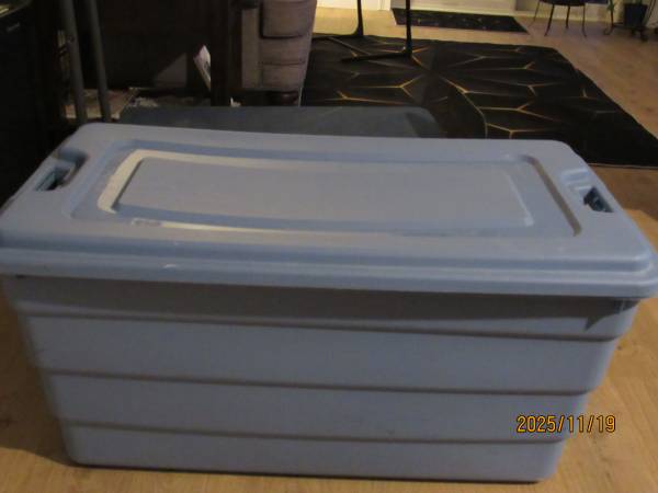 FOR SALE, STORAGE BIN (SIZE 40 INCH'S LONG X 21 INCH'S WIDE X 18 INCH'S DEEP, ) ONE SIDE OF THE COVER IS BROKEN BUT THE BIN COVER STILL OK, IT JUST DOES NOT SNAP, ASKING $25.00, CASH ONLY PLEASE....