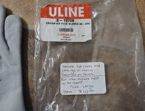 Uline Crusader Flex Gloves Brand new asking $10 Size large Hanle hot cores and casting in metal fabrication shops. For intermittent heat up to 400 degrees Contact: Sue