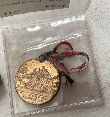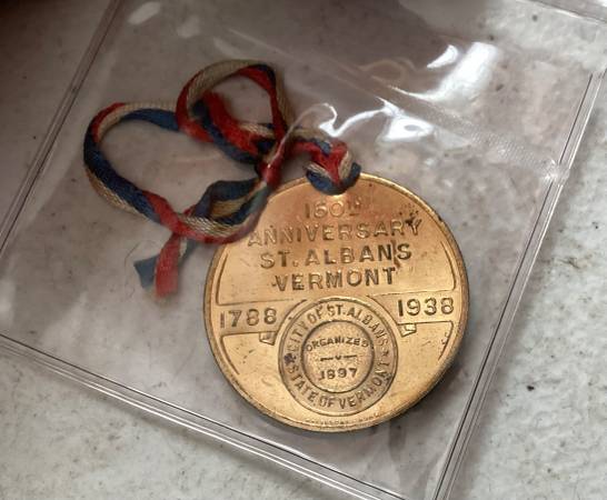 Here I have a 1938 ST Albans VT 150th Anniversary Medal, Coin for sale for $25.00 .I purchased this from Liberty Numismatics of North Salem , NH back on February 19, 2004 . Please look over all the pictures for the best description. Well I’m clearing out some of my older possessions in order to pay the asinine property taxes here in Vermont . Priced to sell ! Call Mark show contact info