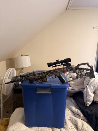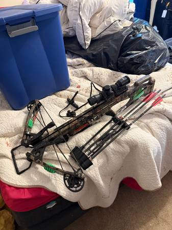 PSE Fang 350 X Bow, like new condition. Comes with 4 Bolts. Three of them have Rage broadheads on them the other bolt has the thick rubber tip for releasing bow.