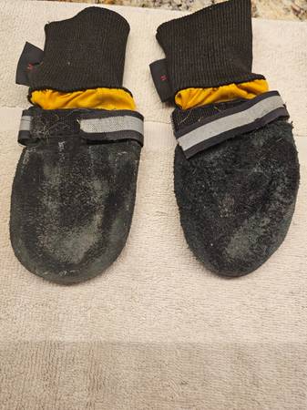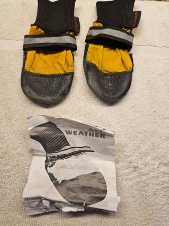 Used breathable, waterproof exterior fabric and can be used in hot/cold weather conditions, hiking, rain or snow. Waterproof coated exterior fabric. Made in Cananda. 3M reflective touch fastener straps that are self tighening, stitched with heavy-duty nylon thread, the leather soles are treated, and the cuffs come up the legs. Salt and water-resistant.