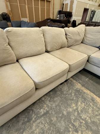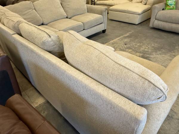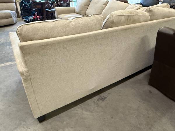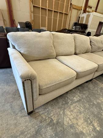 This sectional is in great overall condition and is an Ashley three piece with nailheads as a design. It is a beige color and from a home with a small pet as well as smoke free. It measures 125x100 and is clean.