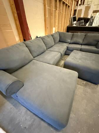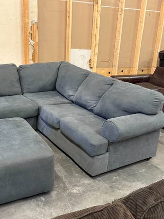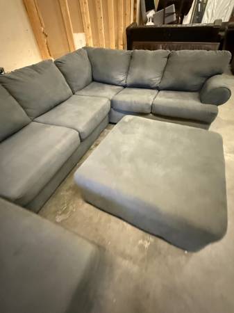 This sectional is in good overall condition and comes in three pieces with the ottoman It is from a pet-friendly, smoke-free home. A few couple of the cushions have a hint of mild dog smell from where a pup sat on them. Measures 70x140x100.