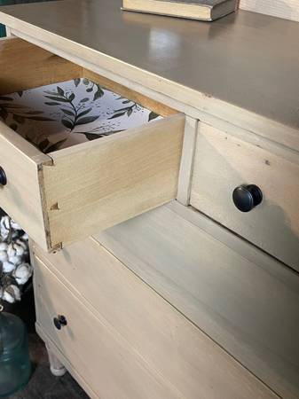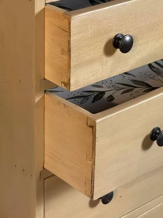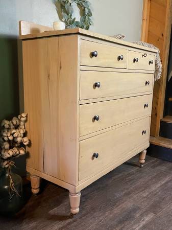 Beautiful solid maple dresser, freshly refinished in a warm natural wash that highlights the wood grain. Sealed for durability and fitted with updated bronze hardware. The drawers glide smoothly and feature handcut dovetail joinery for lasting quality.