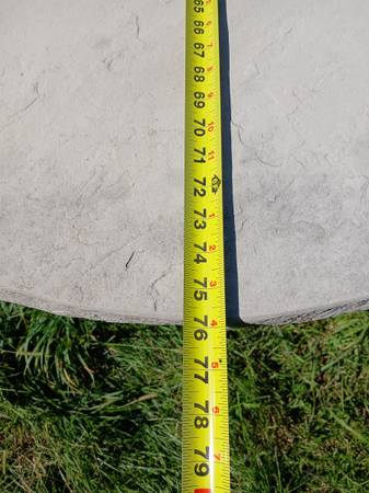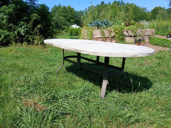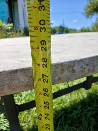 Super sturdy outdoor table. Very realistic faux-stone, fiberglass top with metal legs. Fits an umbrella.