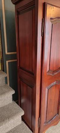 *STUNNING* SEMI ANTIQUE VINTAGE (1983) ARMOIRE, *LOUIS XV* STYLE, 73'' HIGH, X 41.5'' WIDE, X 19.5 DEEP. & CORNICE 47'' X 19.5''. RAISED PANELS FRONT/SIDES/REAR, TWO LOCKS WITH KEYS, TWO DRAWERS, & FOUR ADJUSTABLES SHELVES. EXCELL. CONDITION. NO SMOKE NO PETS. FOR MORE DETAILS CALLS ONLY PLS.: show contact info