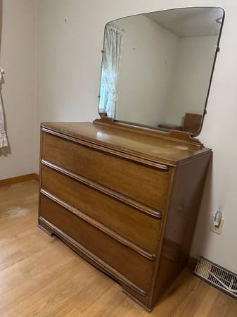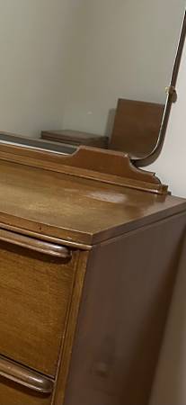 Lenoir dresser Is mid-century modern with attached mirror. This is a solid wood piece with dovetail jointed drawers. Dimensions are 44”w x21”d x35”h. Dresser has a flat iron imprint on the top. Selling for $150. Matching pieces are available and listed separately. Cash only.